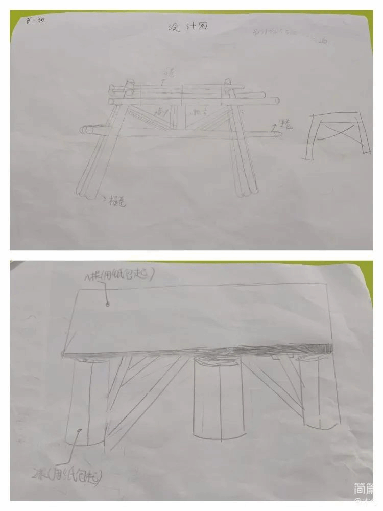 纸桥制作比赛拉开了序幕,首先两个小组分别展示了自己的纸桥设计图。