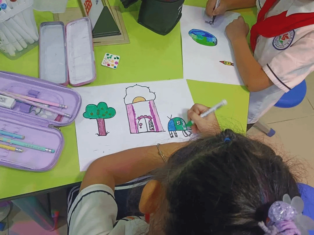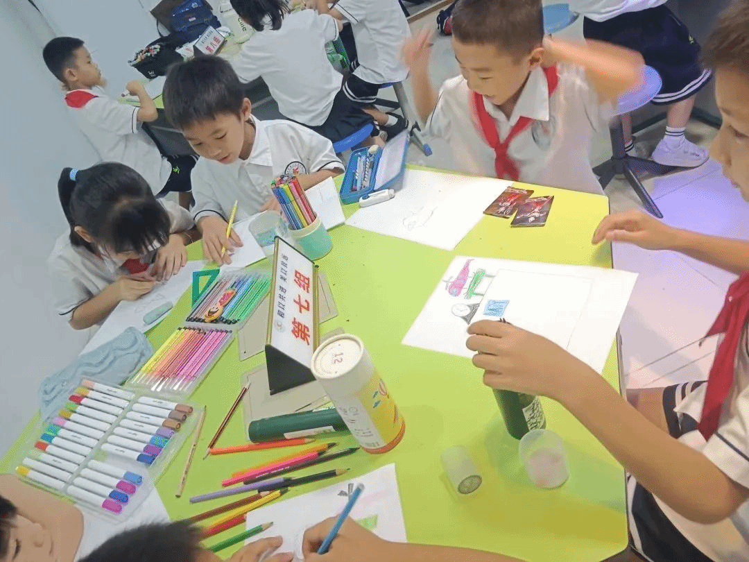 经过老师的简单讲解和观看视频,同学们纷纷拿起水彩笔,构思绘画,勾勒科幻世界。