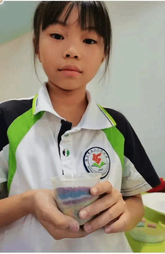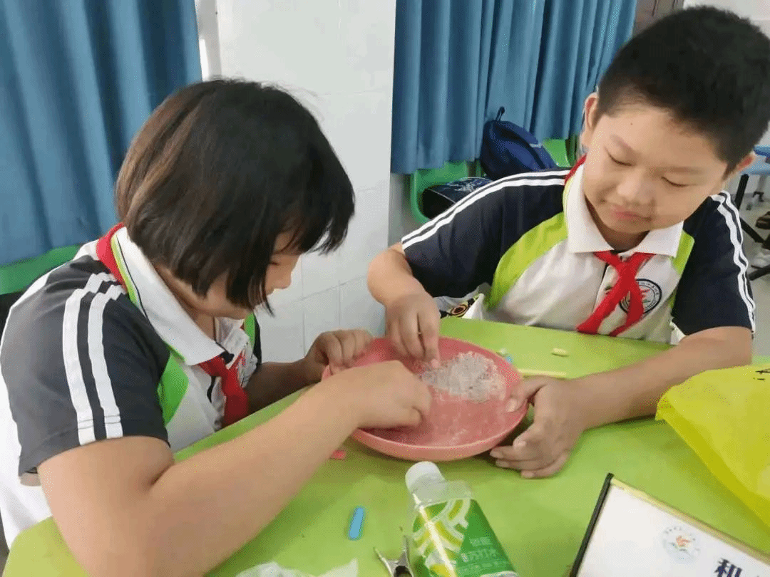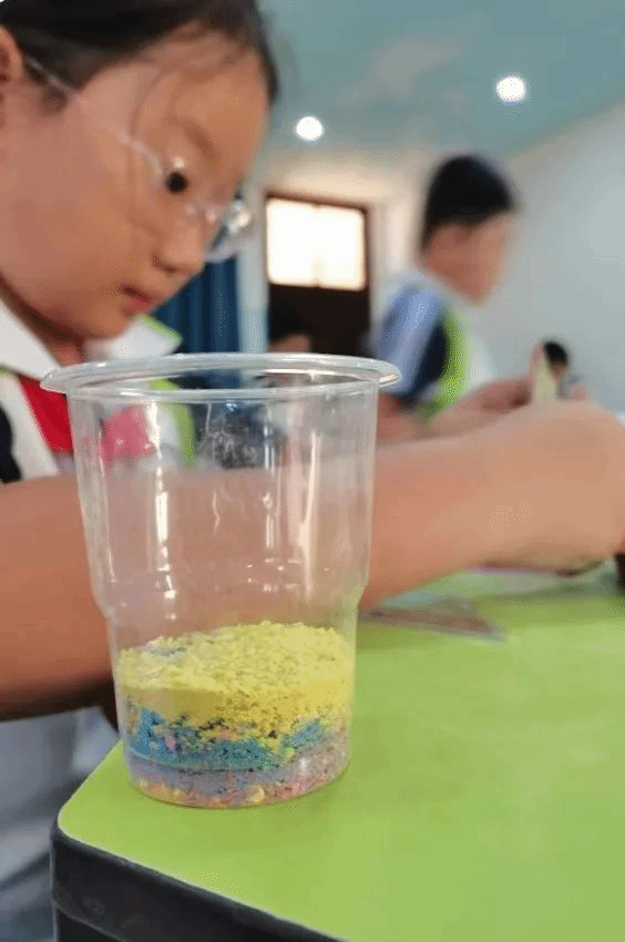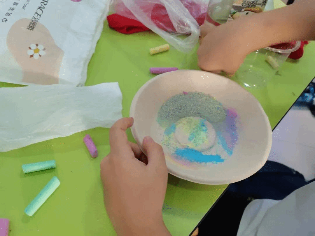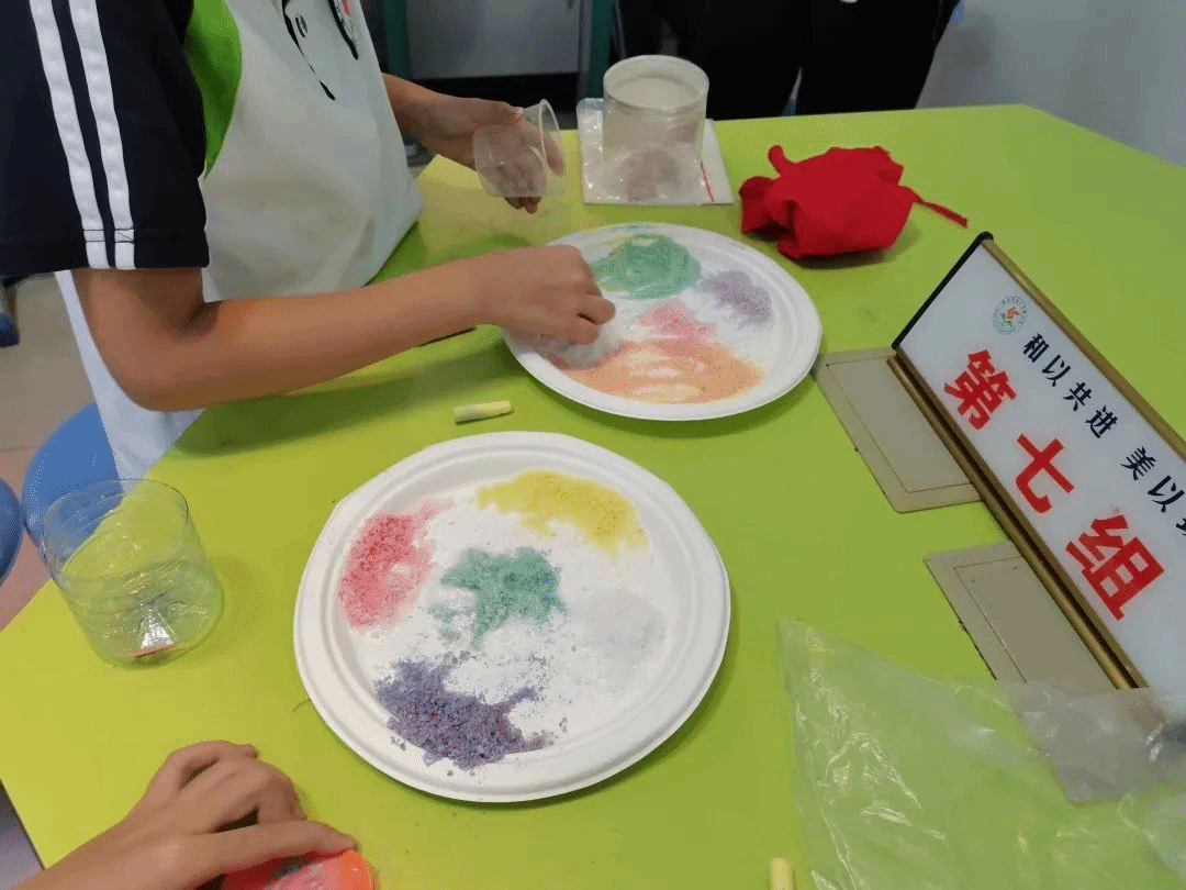 老师把实验所需要的三原色材料—红、黄、蓝三色粉笔发给每个同学,同学们亲自动手实践,把红、黄、蓝三色粉笔在食盐里研磨,将三原色融合起来变成其他颜色,最后把不同颜色的食盐粉末放入透明玻璃杯中,形成属于同学们自己的。