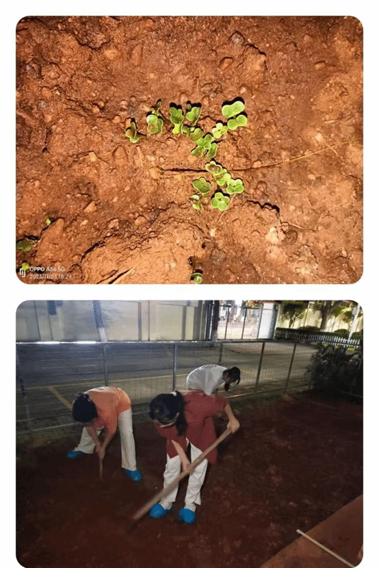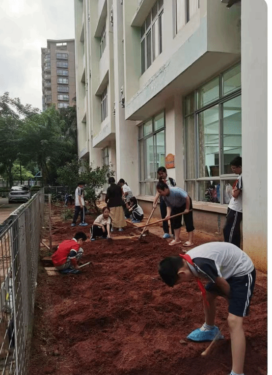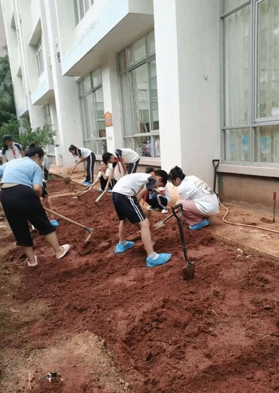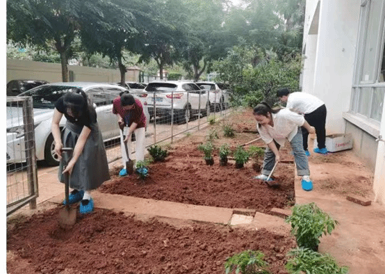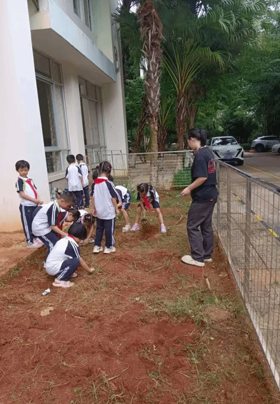 在课后服务的空余时间里,实习生们积极参与到劳动与科学融合的课程活动中,开垦“科学小菜园”,还与老师们商讨种植的种子。