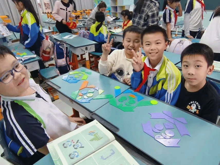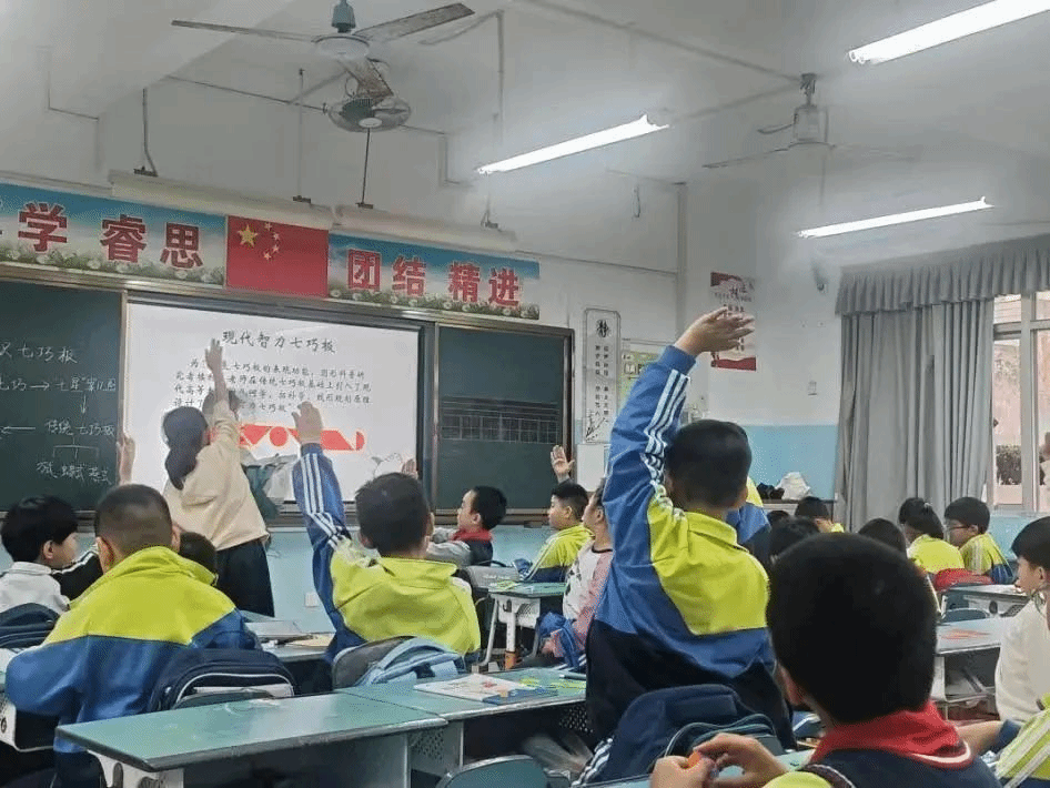 三年级的同学们认真听讲,在梁思婷老师的带领下了解了七巧板悠久的历史和深厚的文化底蕴。同学们积极地回答问题并主动展示学习成果,课堂氛围较好。