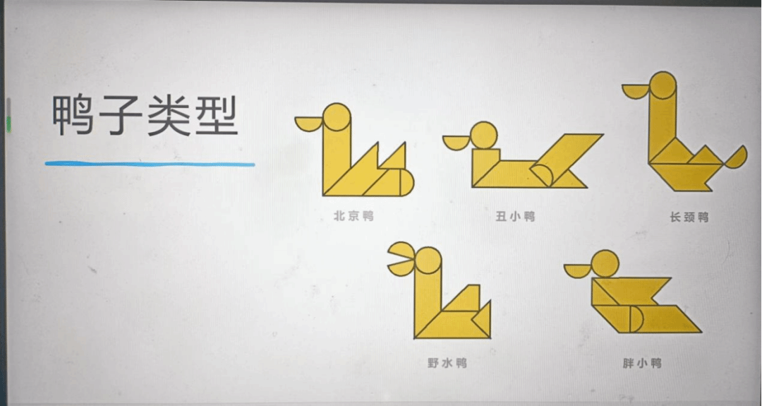 本节课学习了动物模型的拼图,前一节课学生已学习了图形分解。为了加强学生的理解,强化他们的动手操作能力,同时提倡合作探究的学习方式,课程一开始,老师先展示了五幅动物图形,引导学生独立思考,鼓励先拼出图形的同学上台展示他们的拼图和想法。接着开展点评教学,对上台的同学给予肯定和赞赏,然后向全班讲解答案,安慰并激励尚未找到答案的同学。