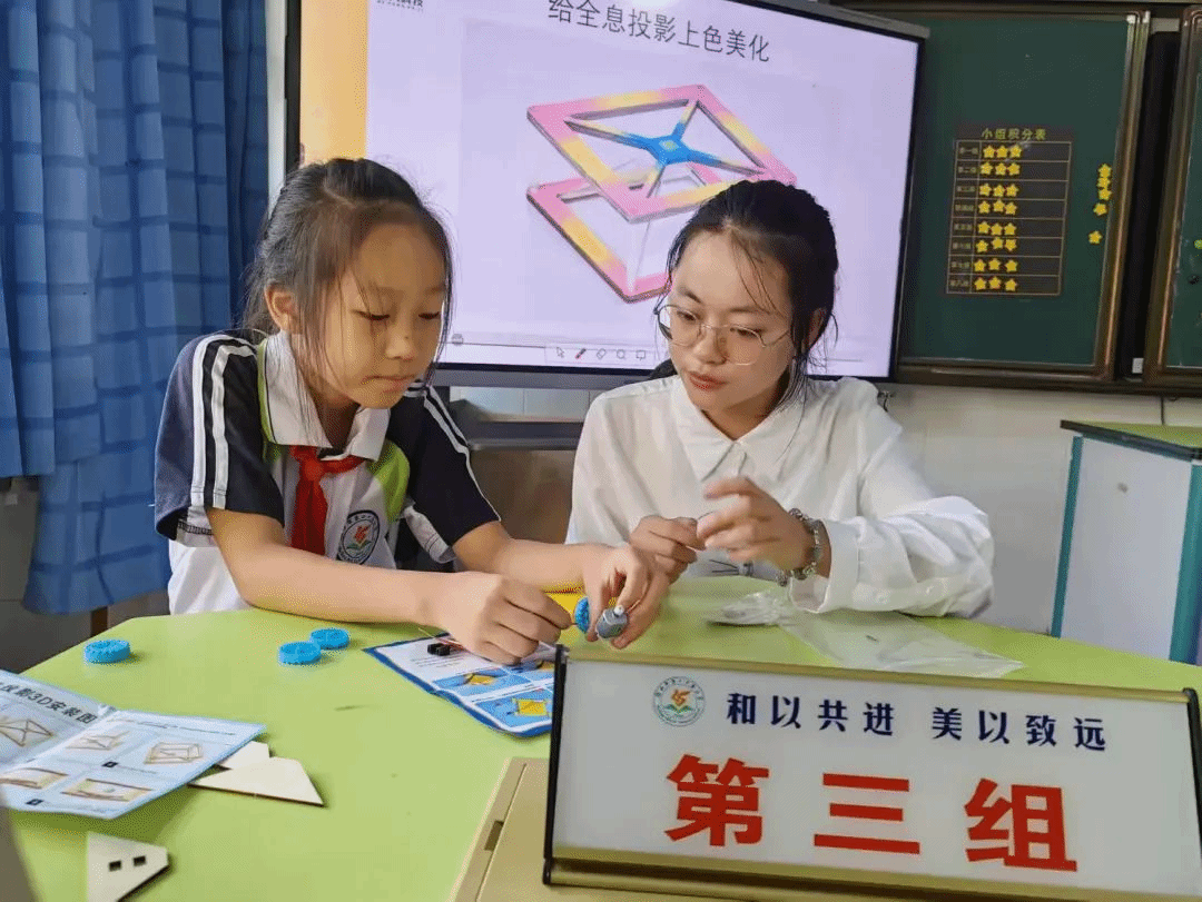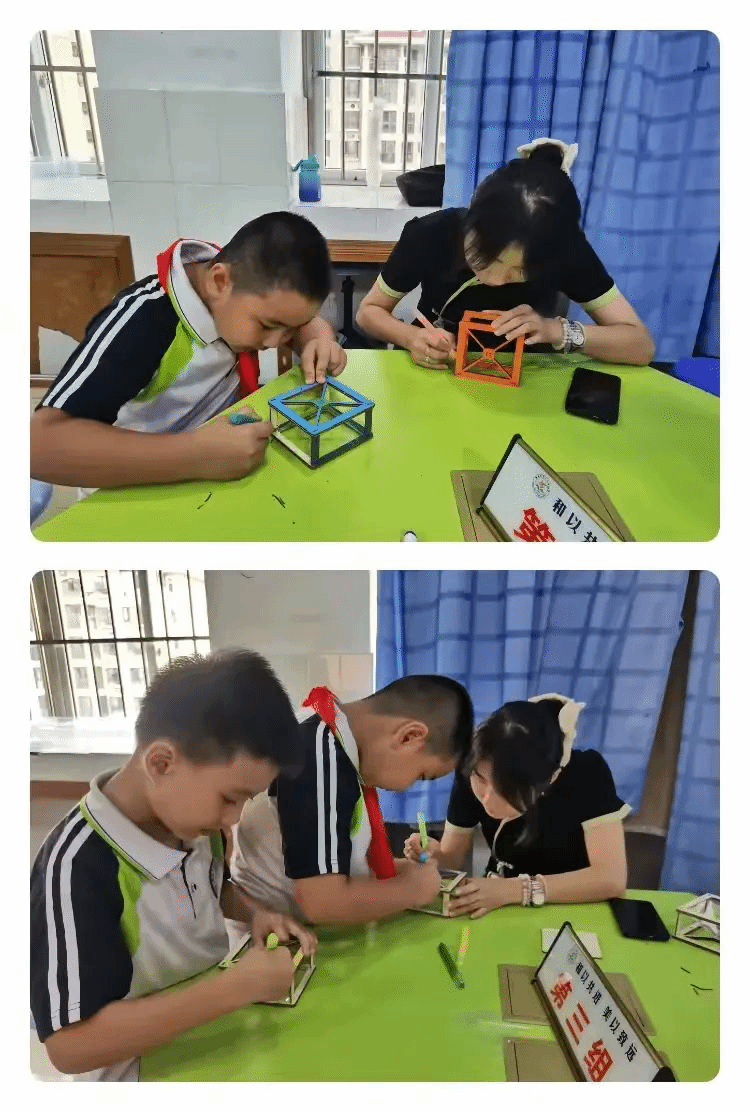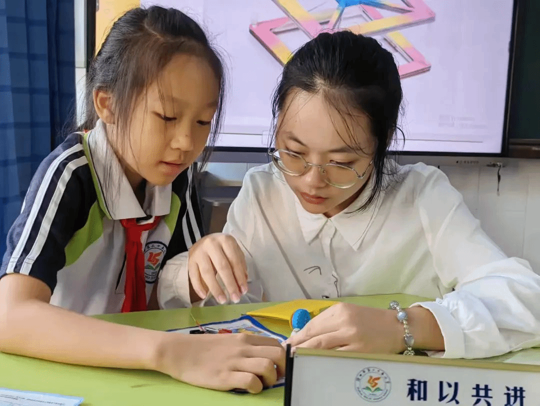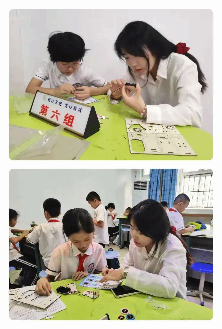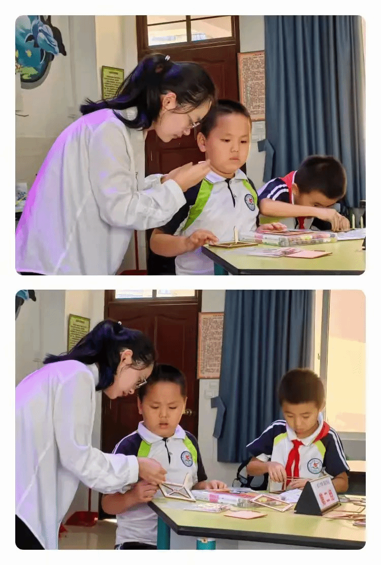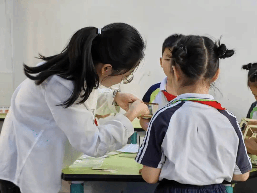 邓婷老师在一旁辅导,恰似一位守护天使。她那专注的眼神如同夜空中最亮的灯塔,关注着每一个孩子的细微变化。她的每一个动作、每一个提示都恰到好处,如同给孩子们的思维之翼增添了助力的清风,让他们在科学探索的天空中飞得更高、更远。
