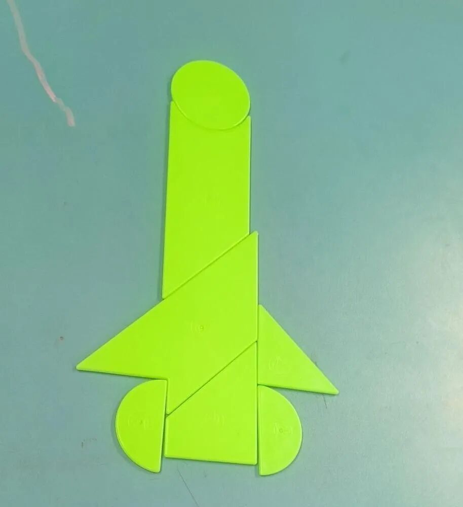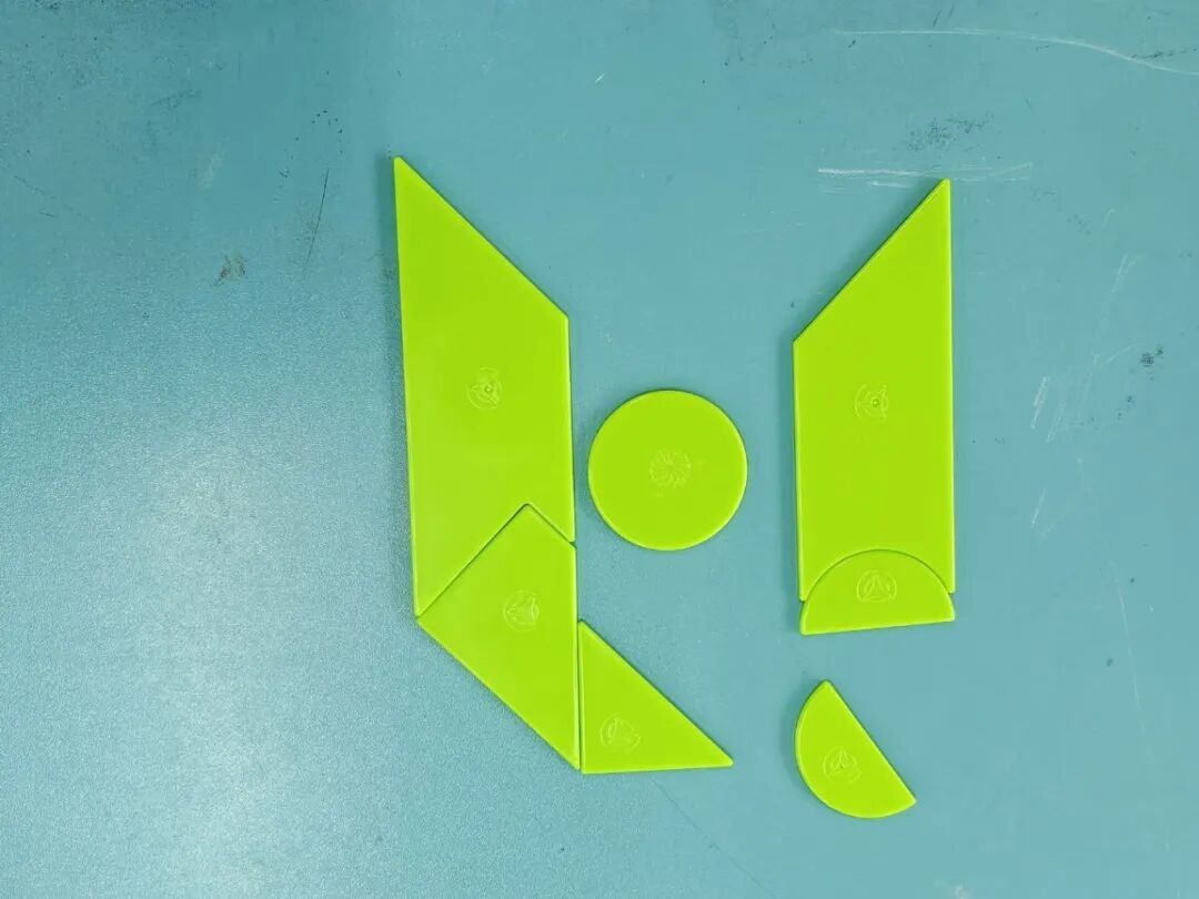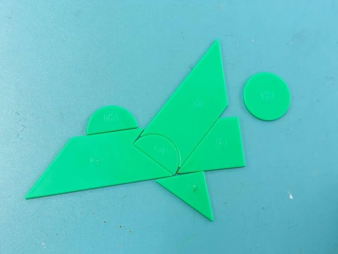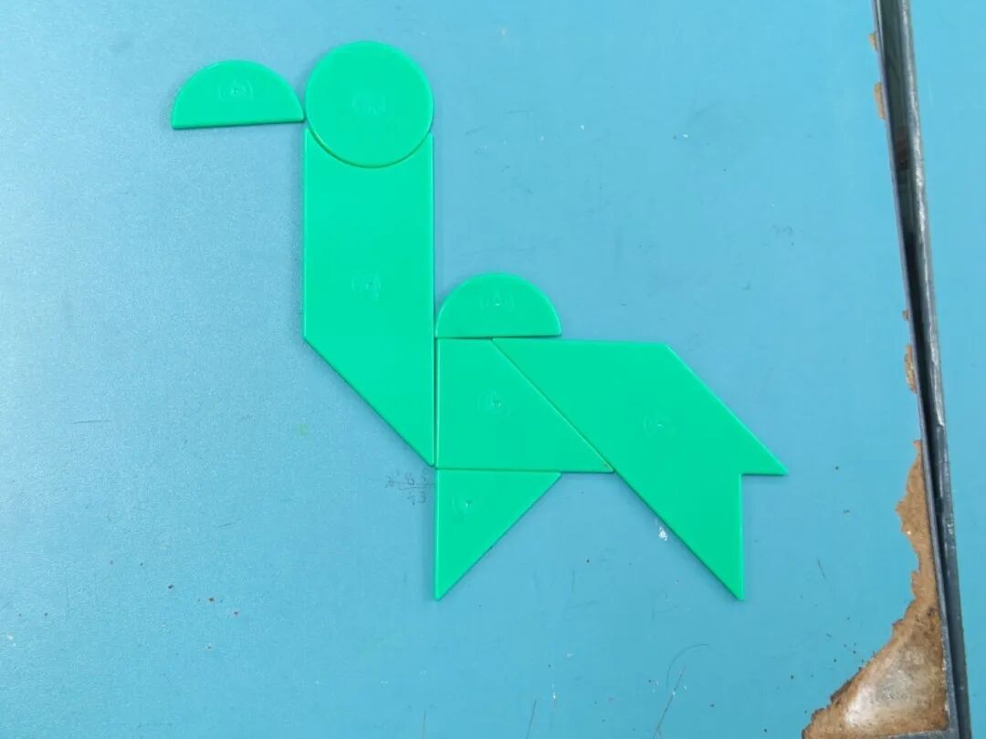 随后,进入“飞机”“鸟类”“踢足球”三大专题设计环节:拼搭飞机时,以中心板和曲型板构建主体,圆形作桨、梯形为翼,轰炸机、航天飞机等造型跃然桌上;创作鸟类图案时,先概括鸳鸯、啄木鸟等飞禽的外形轮廓,再用七巧板精准还原特征;拼摆踢足球动态时,巧用三角形表现肢体伸展,中心板定位膝盖、手臂等动态转折点,将带球过人、射门等动作生动呈现。