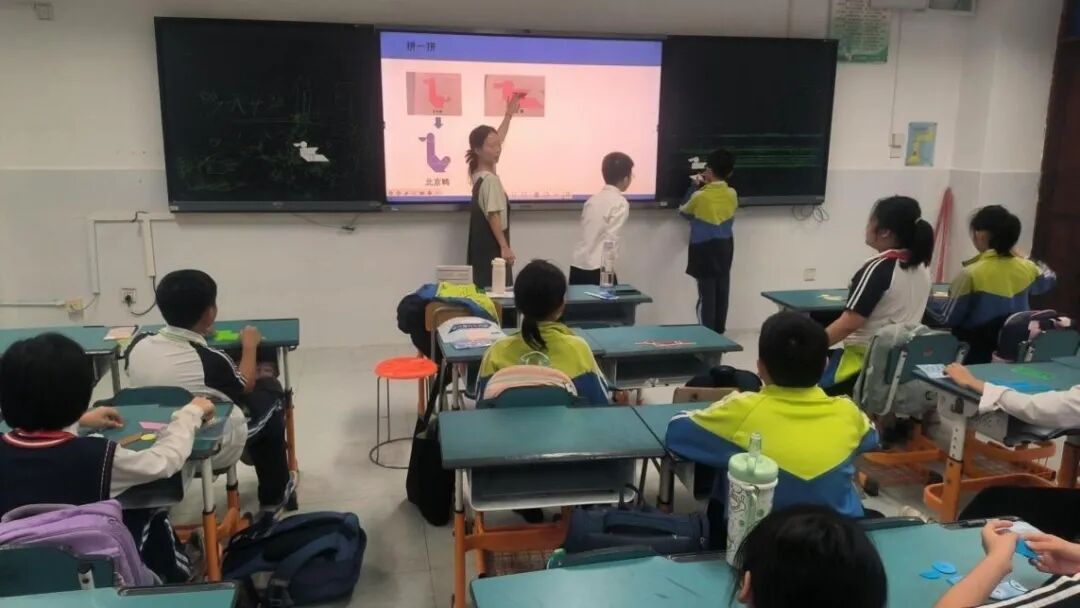 课堂伊始,孩子们在复习旧知环节中,通过青蛙、汉字“问”、小白兔等经典图案的拼摆,熟练运用已学技巧。