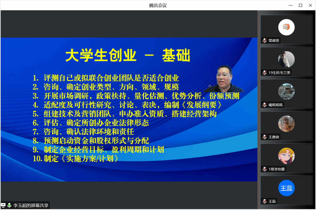 正值毕业之际,为让同学们更加了解创业,增加对创业方案设计的认识,进一步促进我院大学生创业的发展和调动学生的创业积极性。我院特邀中南标质量科学研究院李玉超院长,于11月12日上午在线上云端开展主题为《创业方案》规划设计的大学生创业辅导讲座,理学院学子积极参会。
