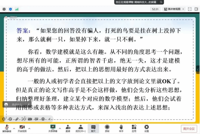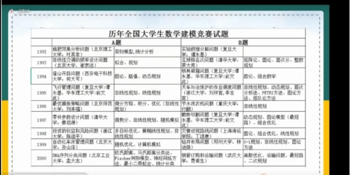 在讲座中,谭敏教授多次引用容易让学生理解的的例子,从教学理念,课程目标,展示历年全国大学生数学建模竞赛试题,赛题发展的特点等多个方面详细的讲解了数学模型与数学构建的课程标准。
