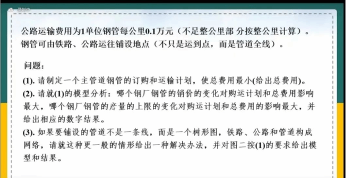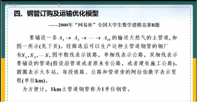 在讲座中,谭敏教授向我们展示了2000年“网易杯”全国大学生数学建模竞赛B题,该赛题要求制定主管道钢管的订购和运输计划,使总费用最小。其问题本质上属于运输问题,是社会经济生活中经常出现的优化问题。主要动机是结合当时西气东输工程的背景, 让参赛者综合运用网络优化、线性规划、二次规划整或数规划等方面的知识, 在建模与求解过程中灵活地发挥自身的能力。