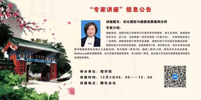 2022年12月3日上午8时,我院有幸邀请湖南科技大学数学与计算科学学院谭敏教授,为我院数学与应用数学专业的学生带来主题为《优化模型与建模竞赛案例分析》的线上讲座。本次讲座由理学院王海华老师主持。