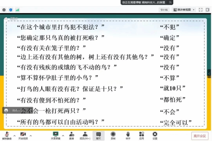 在讲座中,谭敏教授首先介绍了形象的描述数学建模方面的知识。数学建模表面上枯燥乏味,实际上乐趣无穷。谭敏教授通过讨论剩余鸟个数问题、商人们怎样安全过河等例子,生动具体地展现出形象描述数学建模的乐趣。“兴趣是最好的老师”,相信形象的描述数学建模问题的方法定能让同学们受益无穷。
