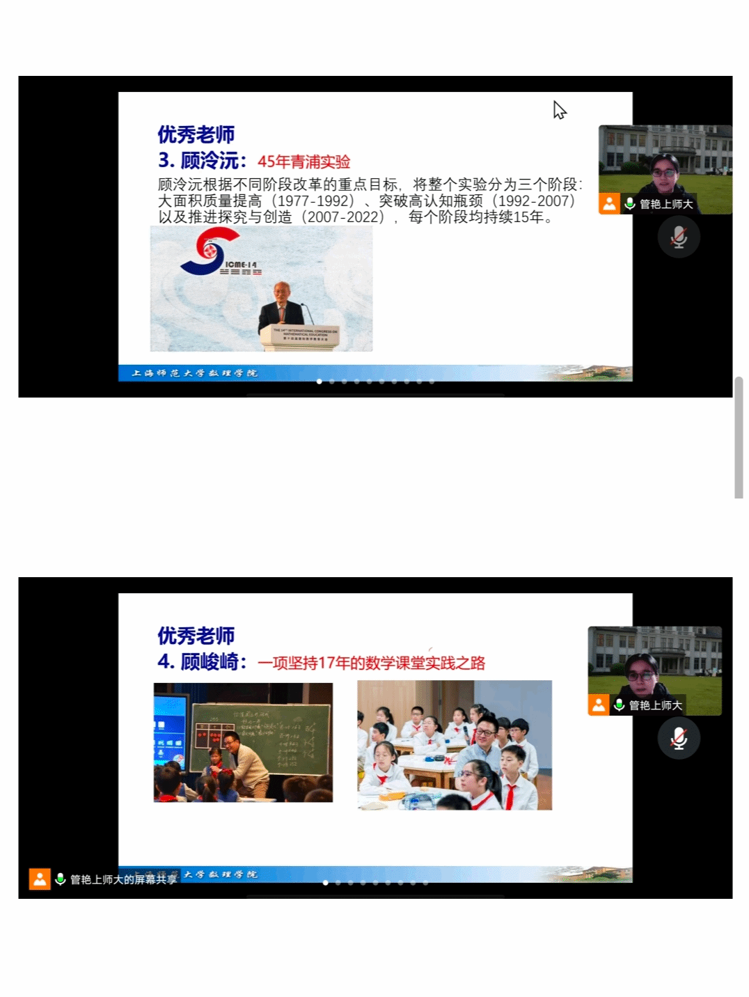 最后,管艳教授分享了顾泠沅老师45年的青浦实验,顾老师根据不同阶段改革的重点目标,将整个实验分为三个阶段:大面积质量提高(1977-1992)、 突破高认知瓶颈(1992-2007)以及推进探究与创造(2007-2022 ),每个阶段均持续15年。同时还举例介绍了顾峻崎老师的一项坚持17年的数学课堂实践之路。这两个精彩的例子,总结出了作为一位优秀数学老师在以后教学之路上应具备其坚持不懈的教学精神。