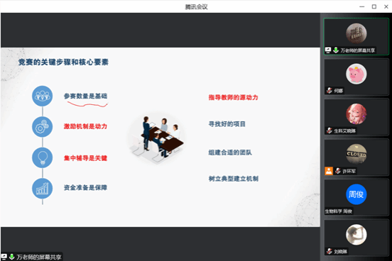 万武波博士强调了实践演练的重要性,是要把演练当作实战,把挑战当做机会。赛前预热,可调整心态,蓄势待发,为大赛做好充分准备。其中需要注意的是对时间把控、语言表达、PPT制作等方面,同时提出汇报时应注重共性和特性兼顾,理性和情怀并举,可以通过网络视频多学习多借鉴,取长补短,进一步完善自己的材料,凝练表达语言。
