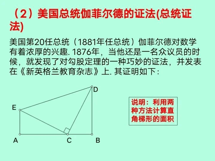 勾股定理提出距今虽已有三千余年,但各种证明方法至今仍接连涌现。据不完全统计,现在世界上已找到了勾股定理的证明方法400余种。由鲁密斯(Loomis,又译作卢米斯)搜集整理的《毕达哥拉斯》(1940年前后)一书就给出了370种不同的证法。