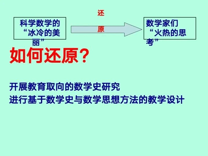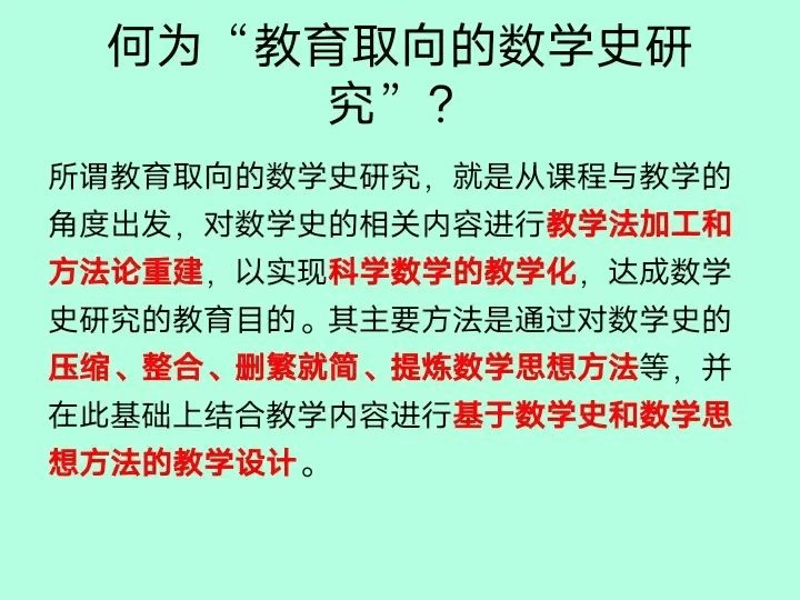杨孝斌教授提出三个问题,一是数学史要学习什么?二是教科书往往用一种“冰冷的美丽”将数学知识呈现出来,如何将这种冰冷的美丽还原为数学家的“火热思考”?三是何为“教育取向的数学是研究”?围绕这三个问题开展教育取向的数学史研究。所谓教育取向的数学史研究,就是从课程与教学的角度出发,对数学史的相关内容进行教学法加工和方法论重建,以实现科学数学的教学化,达成数学史研究的教育目的。其主要方法是通过对数学史的压缩、整合、册繁就简、提炼数学思想方法等,并在此基础上结合教学内容进行基于数学史和数学思想方法的教学设计。