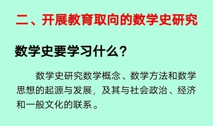 杨孝斌教授对数学史的意义进行综合总结,学习数学史可以帮助人们——产生对数学的强烈兴趣,理解数学的本质,形成正确的数学观,掌握数学的思想与方法,重走数学家数学发现的(思维的)关键性步子。
