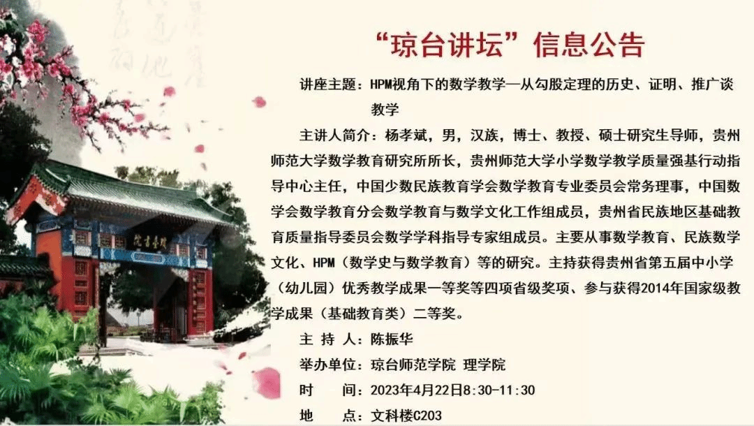 为我院2022级数学与应用数学专业的同学带来主题《HPM视角下的数学教学——从勾股定理的历史、证明、推广谈教学》的线下讲座。本次讲座由理学院陈振华老师主持。
