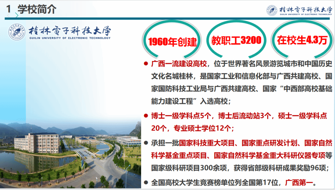 桂林电子科技大学是广西一流建设高校,位于世界著名风景游览城市和中国历史文化名城桂林,是国家工业和信息化部与广西共建高校、国家国防科技工业局与广西共建高校、国家“中西部高校基础能力建设工程”入选高校。学校拥有博士一级学科点5个,博士后流动站3个,硕士一级学科点20个,专业硕士学位12个。