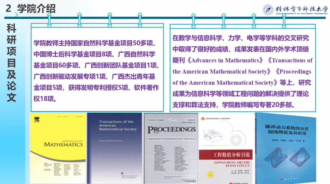 数学与计算科学学院中应用数学学科为广西重点学科;拥有“仪器科学数学理论与方法”二级学科博士点;数学硕士学位一级学科点和应用统计硕士专业学位点;“广西应用数学中心”、“广西密码学与信息安全重点实验室”和“广西高校数据分析与计算重点实验室”等省部级科研平台。