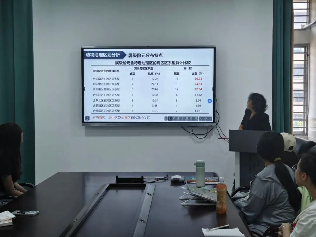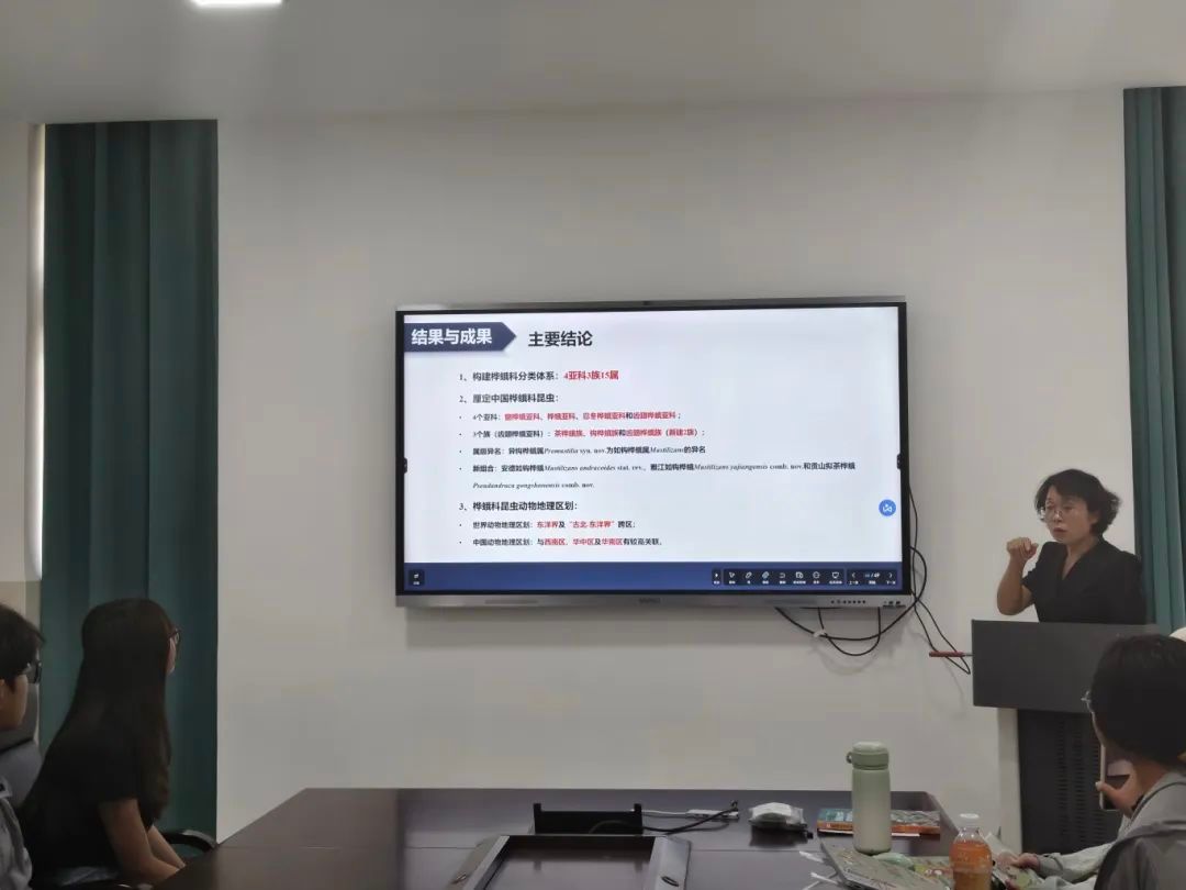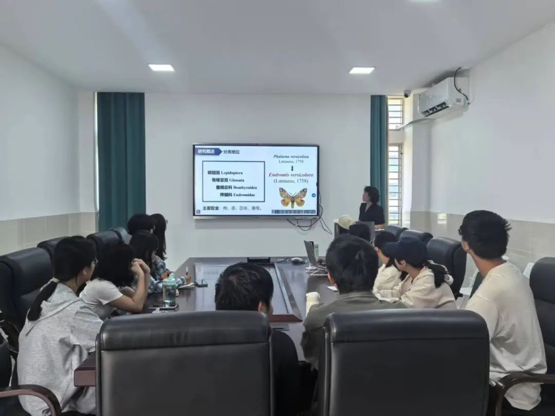 分享会现场,王星老师围绕桦蛾科昆虫分类展开,涵盖研究概述、技术路线、系统分类学研究、动物地理区划分析等方面成果汇报。