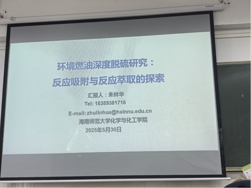 朱林华教授首先对海南师范大学化学与化工学院进行了介绍,尤其是对学位点发展过程、研究生培养、研究生招生等进行了详细介绍。此后朱林华教授从研究背景、反应萃取脱硫体系初探、反应吸附脱硫体系初探等几个方面进行了详细讲解。