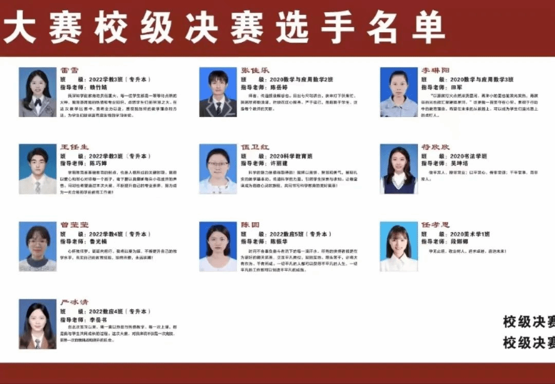 2024届数学与应用数学专业和科学教育专业实习生。选拔程序,各班级研习指导老师根据实际情况,每个班级选拔一名参赛选手。